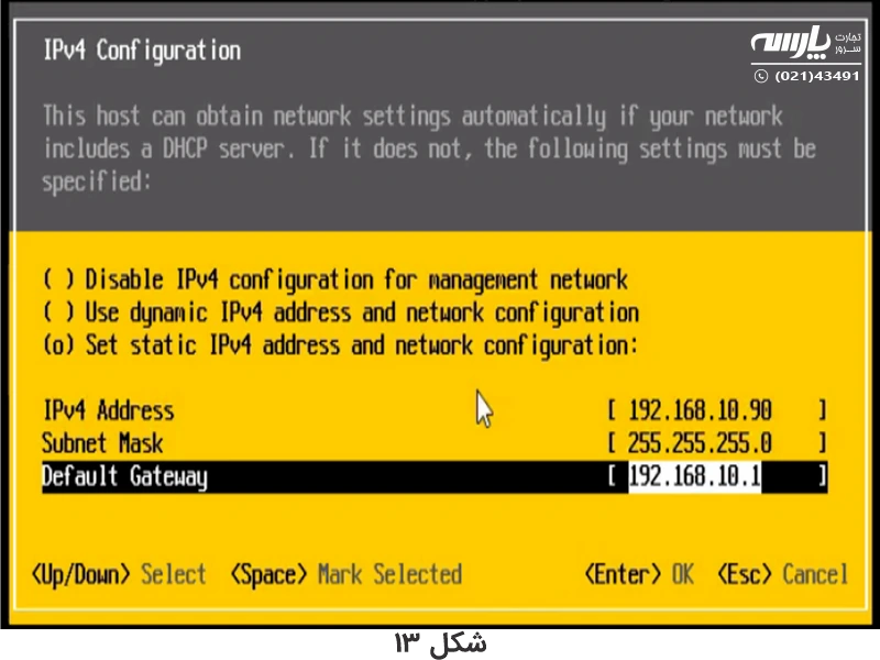 از منوی Configure Management Network، گزینه IPv4 Configuration را انتخاب کنید. در پنجره پیکربندی IPv4 گزینه Set static IPv4 address and network configuration را با استفاده از کلیدهای بالا و پایین انتخاب کنید و سپس کلید Space را بزنید. اکنون میتوانید آدرس IPv4 ترجیحی، Subnet Mask و Default Gateway را به صورت ثابت تنظیم کنید و سپس کلید Enter را بزنید. (شکل 13)