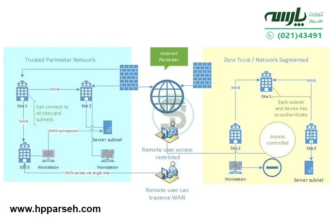 | اعتماد به کاربران و دستگاهها | اعتماد به کاربران و دستگاههای داخل شبکه بهطور پیشفرض | هرگز اعتماد نکن، همیشه تایید کن (Never trust, Always verify) |