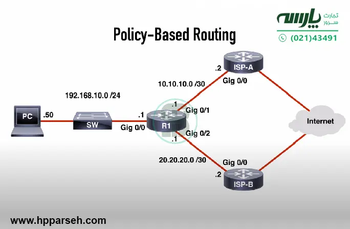 Policy-Based Routing سیسکو روشی است که در آن تصمیمگیری مسیریابی بر اساس قوانین و سیاستهای تعریف شده توسط مدیر شبکه انجام میشود. در حالت عادی، روترها فقط بر اساس آدرس IP مقصد تصمیم میگیرند که بسته از کدام مسیر عبور کند. این روش دست مدیر شبکه را برای کنترل جریان دادهها میبندد.